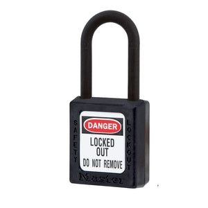 Master Lock 406 Safety Lockout Padlock: Master Lock No. 406 Dielectric Locks, Lightweight Engineered Zenex Thermoplastic Padlocks with Nylon Shackle for Lockout Tagout Applications. Choose Color: Purple, Red, Yellow, Green, Blue, Orange, Black, or Teal. Choose Keying: Keyed Different (KD), Keyed Alike (KA), Master Keyed (MK); Shackle Height: 1-1/2" (38mm) Tall.